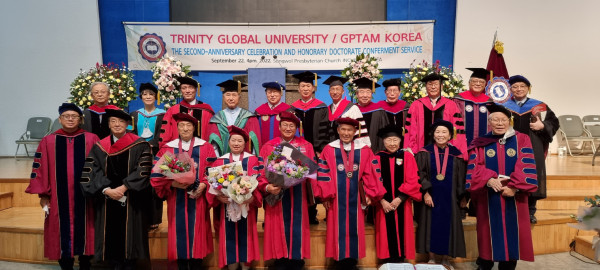 트리니티국제대학교(총장 김연택, 학장 임재성)는 지난 9월 22일 송월교회(담임 박삼열 목사)에서 개교 2주년 기념 및 변인복 박사를 비롯한 이영무 박사, 이배영 박사, 최빅토리아 박사의 명예박사 학위 수여 감사예배를 갖고 글로벌 인재 양성을 통한 세계선교에 주력할 것을 다짐했다.