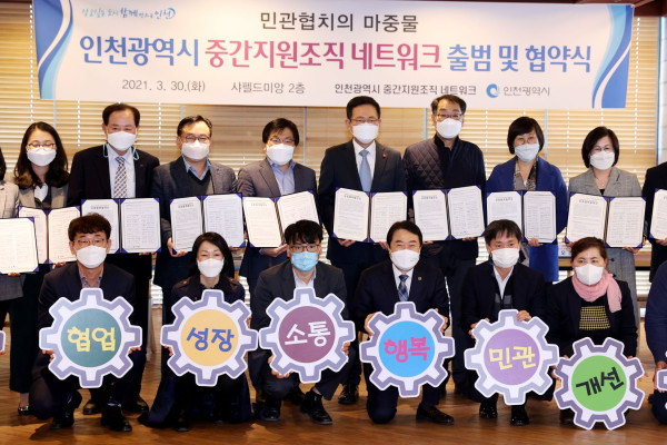 포토뉴스 분류 인천광역시 중간지원조직 네트워크 출범 및 협약식 작성자 정보 최고관리자 작성 작성일 2021.03.30 22:05 컨텐츠 정보 2,760 조회 목록 본문 박남춘 인천광역시장, 신은호 시의회의장 등 참석자들이 30일 샤펠드미앙에서 열린 '인천광역시 중간지원조직 네트워크 출범 및 협약식'에서 기념촬영을 하고 있다. SNS 공유 관련자료 이전 최재형 독립운동가 4대손 의료비 지원 감사패 전달식 작성일 2021.03.31 16:02 다음 인천국제공항 개항 20주년 기념식 작성일 2021.03.30 22:03 댓글 0 등록된 댓글이 없습니다. 로그인한 회원만 댓글 등록이 가능합니다. 목록
