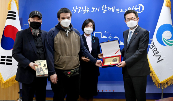 박남춘 인천광역시장이 31일 시청 접견실에서 (사)독립운동가 최재형 기념사업회 문영숙 이사장과 최재형 독립운동가 4대손 최일리야 군으로부터 인천시의 의료비 지원에 대한 감사패를 전달받고 있다.