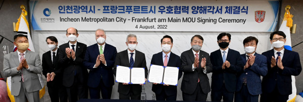 유정복 인천광역시장과 피터 펠트만(Peter Feldmann) 독일 프랑크푸르트시장이 지난 8월 4일 시청 접견실에서 열린 '인천광역시-프랑크푸르트시 우호협력 양해각서 체결식'에서 협약서에 서명을 한 뒤 기념촬영을 하고 있다.