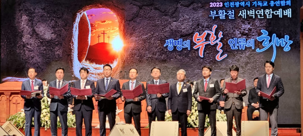 인천기독교총연합회(총회장 진유신 목사, 이하 인기총)는 지난 4월 9일 새벽 5시30분 주안교회(담임 주승중 목사)에서 유정복 인천광역시장과 홍영표 의원을 비롯해 정관계 인사 및 증경총회장 이종복 감독 등 교계 지도자와 교인 등이 참석한 가운데 ‘생명의 부활, 인류의 희망’을 주제로 2023 인기총 부활절새벽연합예배를 갖고 부활의 증인된 삶을 살 것을 다짐했다.